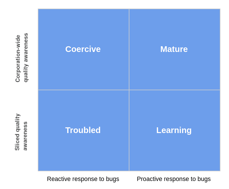 Will you ask those questions to your team? We can help by giving them to you without even asking. Everything would be available at our ASM, covering from very technical to strategic levels. Bowens propose a simple 2x2 matrix to assess how an organization is performing based on quality awareness and response to bugs. Fluid Attacks can help you moving towards the upper-right.